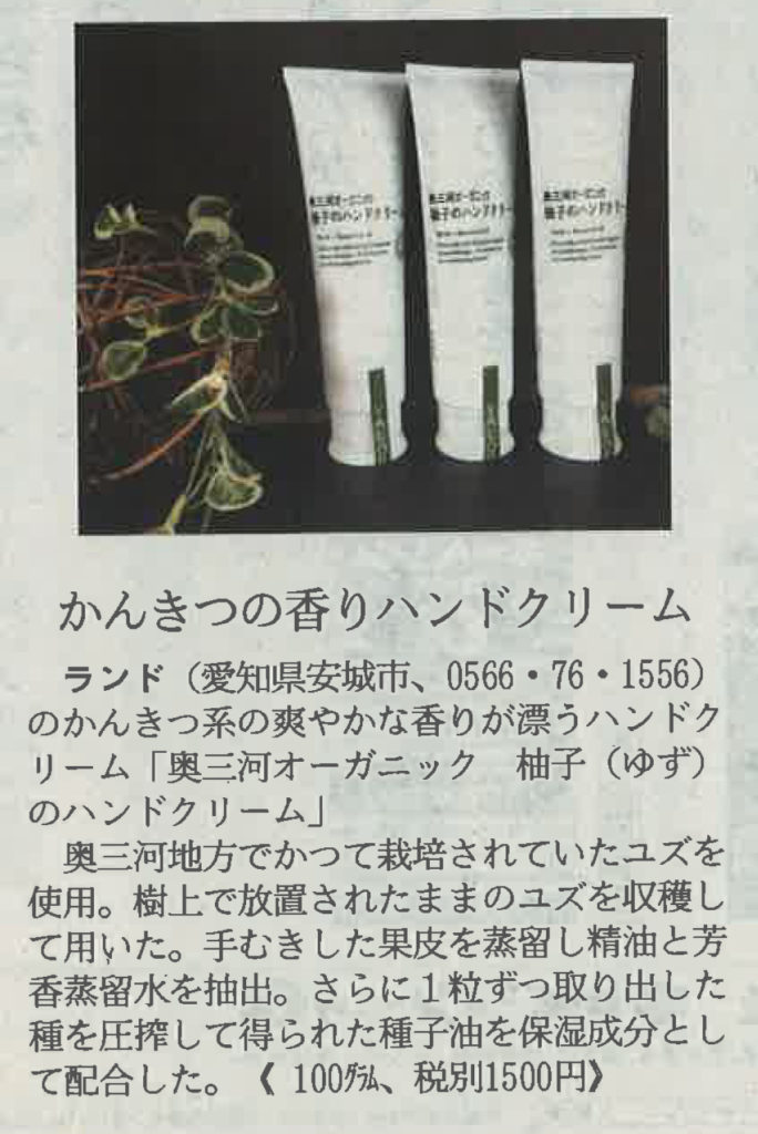 『かんきつの香りハンドクリーム』新聞掲載されました。